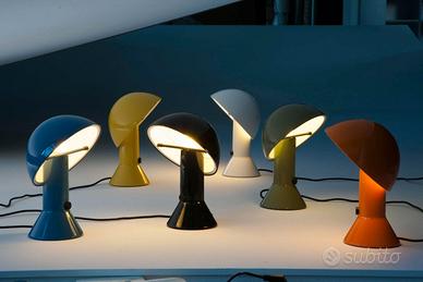 Lampada da tavolo a luce diretta e indiretta, struttura stampata interamente in resina . La lampada è formata da una base tronco-conica e da un diffusore orientabile di forma semisferica. Disegnata da Elio Martinelli nel 1976, l’Elmetto pur nel rigore del design, privilegia la funzionalità d’uso con un interruttore di grandi dimensioni sul corpo centrale, facile da trovare anche al buio e un riflettore che si orienta con la semplice pressione di un dito e consente di schermare la sorgente luminosa.