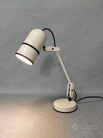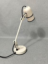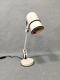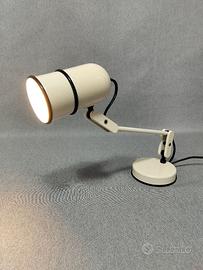 Rara lampada da scrivania della serie “Erazio”, firmata da Santo Lanzafame e prodotta da Cos.Mo. (Costruzioni Modulari) Roma nei primissimi anni ’80. Il celebre “Sistema Erazio” vinse l’IF Design Award nel 1982, affermandosi come esempio significativo di design italiano postmodernista. La serie comprendeva diversi modelli a morsetto oltre alla versione da tavolo; quest’ultima, in particolare, è oggi piuttosto rara, anche perché la produzione durò pochissimo tempo. La lampada è composta da elementi modulari che consentono ampia regolazione e massima flessibilità, rendendola estremamente funzionale oltre che iconica. Realizzata in metallo verniciato colore bianco perla. Imianto elettrico originale. Attacco lampadina E27 Ottime condizioni Altezza media 37 cm Base 11 cm