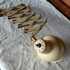 Lampada estensibile vintage, riflettore diametro 14 alto 18 con interruttore a rotazione e portalampada E27. I distanziali e la vite di serraggio sono in ottone o comunque in metallo ottonato. Chiusa è circa 23cm e il braccio aperto tutto esteso è circa 100cm. Vedere le fotografie. Ha qualche graffio e macchia. Visto e piaciuto. Vendo a 130€