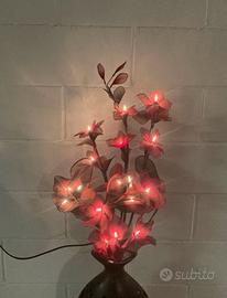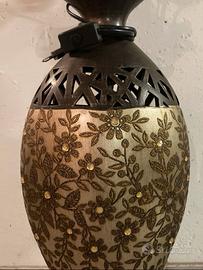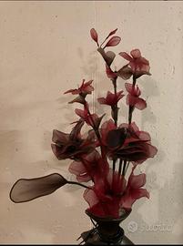 Lampada vaso con dettagli oro e fiori bordeaux/neri che si illuminano se si collega alla corrente. In basso a sinistra il vaso è leggermente sbeccato.