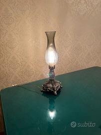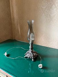Lampada da tavolo decorativa caratterizzata da una base elaborata in metallo (probabilmente argento o placcato argento), paralume in vetro. Stile: Classico/Barocco con dettagli lavorati sulla base. Funzionalità: Elettrica, con cavo e interruttore visibili.