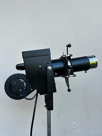 Il faro fa un fascio di luce concentrato in un cerchio e, con l’utilizzo di una piccola leva il fascio di luce si puo strettire o allargare a piacinento tipo “ Occhio di bue “ grazie ad un diaframma; Inoltre ha un accessorio motorizzato ( un disco ) che, ruotando, fa cambiare di colore al fascio di luce.