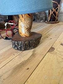 Lampada fatta a mano con lampadina integrata e base in legno.