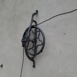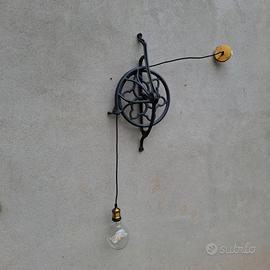 Lampada da parete realizzata con una vecchia ruota da macchina da cucire marca Singer