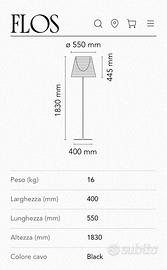 Bellissima lampada da terra di Philippe Stark disegnata nel 2007, usata ma senza alcun difetto o striscio, tenuta benissimo da proprietario architetto. Vendo causa traslocco. Caratteristiche: Apparecchio di illuminazione da terra a luce diffusa. Base, supporto asta e supporto diffusore in lega di Zama pressofusa lucidata e cromata. Copertura della base in lamiera d'acciaio PO4 zincata. Diffusore interno e supporto porta lampada in PC (policarbonato) stampato ad iniezione di colore opalino In vendita da Flos per €1650. Ritiro o consegna nel raggio di 50 km. Ci si puó accordare in caso per la spedizione.