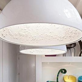 NUOVA IN VENDITA. LAMPADA A SOSPENSIONE DAL DESIGN ELEGANTE E SCENOGRAFICO. ESTERNO ESSENZIALE E PULITO, CONTRASTATO DA UN INTERNO DECORATIVO IN GESSO CON DETTAGLI RICCHI CHE DIFFONDE UNA LUCE CALDA E SOFFUSA. IDEALE PER ZONA LIVING, SALA DA PRANZO O AMBIENTI DI RAPPRESENTANZA. UN OGGETTO DI DESIGN ICONICO CHE UNISCE TRADIZIONE ORNAMENTALE E LINEE CONTEMPORANEE.