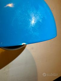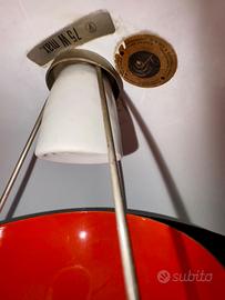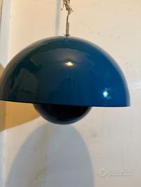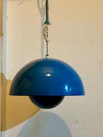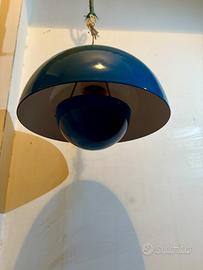 Lampada a sospensione modello Flowerpot VP1, disegnata da Verner Panton e prodotta da Louis Poulsen & Co A/S (Copenhagen), anni ’60–’70. Esemplare originale d’epoca, riconoscibile dalla presenza dell’etichetta vintage Louis Poulsen “Copenhagen” e dalla struttura interna con portalampada in ceramica. Design iconico del modernismo danese, caratterizzato dalla tipica doppia calotta emisferica. Versione con esterno blu e interno rosso, combinazione cromatica tipica della produzione del periodo, pensata per creare una luce calda e diffusa. Condizioni: buone condizioni generali con segni del tempo e dell’uso coerenti con l’età. Presenza di leggere tracce e segni all’interno della calotta. Impianto elettrico originale d’epoca; il funzionamento non è stato testato e il cavo mostra segni evidenti di usura. Si consiglia la sostituzione del cavo per un utilizzo in sicurezza. Rosone a soffitto non presente. Oggetto autentico e collezionabile, rappresentativo del design anni ’60 firmato Verner Panton per Louis Poulsen.