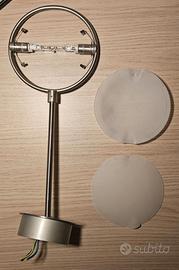 Possono essere usate come lampade da soffitto o da parete. Struttura in metallo cromato, diffusore in vetro stampato, sabbiato e temperato di forma circolare; quest'ultimo può ruotare su se stesso e orientare la luce in diverse direzioni.