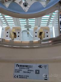 Plafoniera da incasso della serie Energy 2 EL prodotta da Fosnova ( gruppo Disano Illuminazione) Modello: Energy 2 EL. Alimentazione: 220-240V, 50/60Hz. Lampade: Progettata per 2 lampade da 26W con attacco FSQ G24q-3 (fluorescenti compatte a 4 pin). Grado di protezione: IP20V.A. (protezione contro corpi solidi superiori a 12mm nel vano ausiliario). IP44V.L. (protezione contro gli spruzzi d'acqua nel vano lampada). Produzione: Made in Italy.