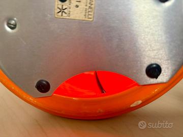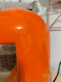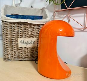 Espressione audace e giocosa del design radicale italiano, la lampada da tavolo Longobarda fu creata da Marcello Cuneo per Gabbianelli nel 1966. Scultorea e immediatamente iconica, questa lampada in ceramica cattura lo spirito degli anni '60 con la sua forma futuristica, i colori saturi e la sensibilità pop. Realizzata in ceramica smaltata e rifinita in un vivace arancione lucido, la silhouette fluida e monolitica della lampada è tanto una fonte di luce quanto un'opera d'arte. La sua parte superiore ad arco si curva in una base fluida che nasconde la lampadina e dirige una luce calda e brillante verso il basso e verso l'esterno, creando un effetto drammatico sia che sia accesa che non. La forma pura della lampada non è interrotta da cuciture o interruttori visibili, con un meccanismo di accensione e spegnimento nascosto e una collocazione interna della lampadina che ne esalta l'integrità scultorea. Questo particolare esemplare è in ottime condizioni d'epoca ed è stato ricablato professionalmente alcuni anni fa per garantire un utilizzo sicuro e funzionale. L’oggetto tuttavia presenta una lieve crepa lineare come evidenziato nella foto n• 5e alla base nella foto n•6. Segni che non impattano minimamente l’estetica dell’opera d’arte. Dimensioni Altezza: 25 cm Larghezza: 16 cm Profondità: 16 cm #ceramica #ceramiquevintage #ceramicaitaliana #gabbianelliceramica #gabbianelliceramiche #gabbianelli #marcellocuneo #italianquality #italiandesign #italiandesigner #madeinitaly #modernariato #modernariatoitaliano #vintage