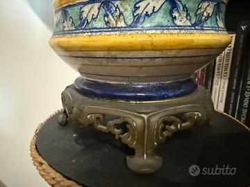 Importante lampada da tavolo di grandi dimensioni (altezza totale 94cm), con corpo in ceramica decorata a mano nei toni del blu, giallo ocra e verde acqua, ispirazione rinascimentale stile Deruta.