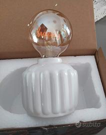 Bellissima lampada decorativa Andrea Fontebasso, con base in ceramica bianca, e la scritta "Happy" all'interno. Perfetta per creare un'atmosfera accogliente e rilassante.