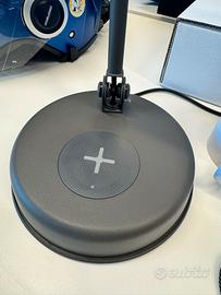 Lampada in metallo con semplice forma oversize, ispirata alle vecchie lampade industriali. Molto adattabile a qualsiasi piano di lavoro o scrivania grazie al braccio mobile. Lampadine e14 inclusa. Dispone di ricarica wireless per cellulari tramite base a induzione e porta usb posteriore per seconda ricarica tramite cavo.