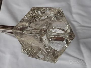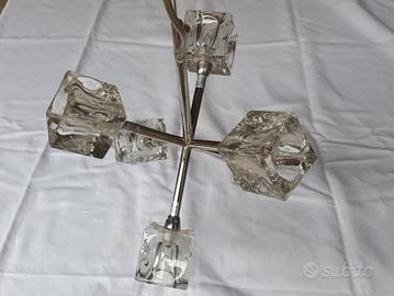 - Struttura in metallo argentato e 4 paralumi in vetro trasparente a forma di cubo.