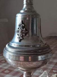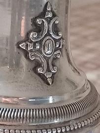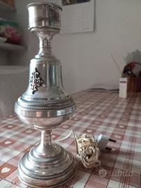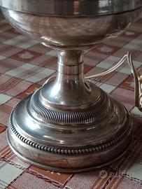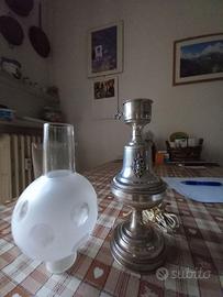 Lampada da tavolo in argento 800 convertita all'uso elettrico. Sfera in vetro smeriglio con decori. Altezza totale (compresa ls sfera di vetro) cm. 37 . Peso senza sfera gr.300 c.a.