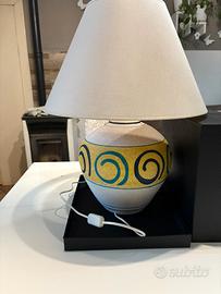 Lampada da tavolo con base in ceramica decorata e paralume in tessuto. Oggetto decorativo in stile classico, ideale per salotto o camera. In buone condizioni estetiche, funzionante. Venduta come da foto.