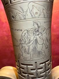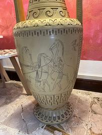 vendo splendida lampada da terra di grandi dimensioni (altezza circa 170 cm), pezzo d'arredamento di grande impatto visivo e ottima fattura. La particolarità di questo oggetto è la base a forma di anfora, realizzata in ceramica molto pesante e rifinita nei minimi dettagli. A differenza delle imitazioni economiche, le decorazioni a tema mitologico greco (carri e cavalli) sono incise direttamente nel materiale e non semplicemente stampate, a testimonianza della qualità artigianale del pezzo. Dimensioni: Altezza importante (circa 1.65/1.70 m), ideale come pezzo centrale in un salone. Dettagli: Lavorazione con motivi classici e fusto centrale ad effetto "candela". Illuminazione: Perfettamente funzionante, predisposta per due lampadine che offrono un'ottima resa luminosa. Stato: L'oggetto è integro e ben conservato in ogni sua parte. Data la qualità dei materiali, la lampada è molto pesante, garanzia di stabilità e valore.