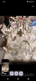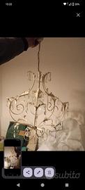 Elegante lampadario con dettagli in ferro battuto e pendenti in vetro.