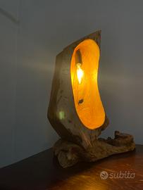 Splendida lampada in legno di olivo marchigiano. Pezzo unico, costruito a mano, levigato per esaltare le magnifiche e naturali venature del legno. Lampada a led a filamento compresa.