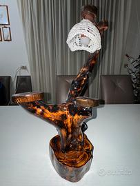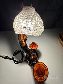 Lampada lavorata a mano in legno di ulivo salentino con effetto briciato, dotata di coprilampada realizzata all’uncinetto e di filo con bottone a presa piccola.