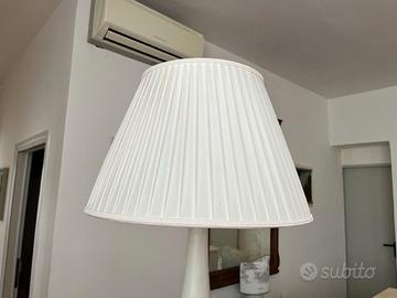Lampada di grande dimensione in legno con lucidatura ecologica gesso stucco e cera naturale alta cm 110 base cm 25x25 corpo altezza 76 cm diametro cm 17 cappello plizze a tronco cono dimensione cm 45xh31x26 con passamaglieria in tinta oggetto di alto arredamento 348 6902654