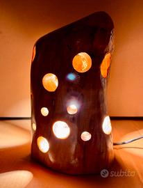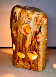 Lampada realizzata dal tronco di ulivo, trattata e decorata artigianalmente per creare un ambiente rilassante con la sua luce calda.