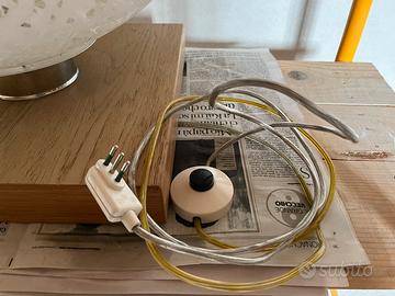 Lamapa da tavolo o pavimento costituita da una sfera in resina diametri circa 50 cm su una base in legno massello pianta quadrata 37x37 cm. La lampada è alta 60 cm complessivamente e produce una luce soffusa ideale per un salotto. Accensione con pulsante anche a piede.