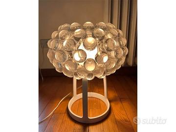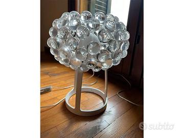 Lampada da tavolo composta da sfere in polimetilmetacrilato trasparente. Schermo in vetro soffiato satinato bianco. Stelo composto da tre sostegni che raccordano la base tonda a terra con il richiamo alla forma sferica del diffusore.