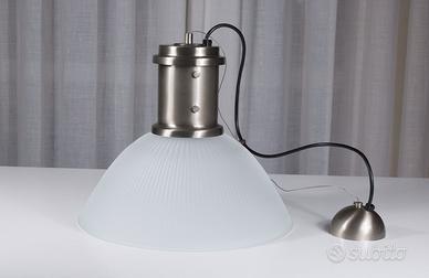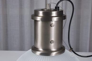 Iconica lampada da soffitto che unisce il fascino vintage dell'estetica industriale alla qualità costruttiva dei materiali pregiati. Realizzata in metallo finemente nichelato con diffusore in vetro rigato di cristallo, che crea giochi di luce e ombre molto caratteristici.