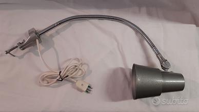Vendo lampada industriale Seminara Torino anni '50, colore grigio martellato, in alluminio è flessibile cromato, interruttore sul fissaggio in alluminio, porta lampade snodabile, misura tutta dritta da base a lampada 68 cm, solo l'asta misura 58 cm, porta lampada misura 15 cm x diametro dietro 5,5 cm, diametro davanti sede lampadina 11,5 cm, morsetto largo 5 cm, cavo lungo 1,70 m, peso 1 kg. Funzionante in ottimo stato. Spese di spedizione 10 euro.