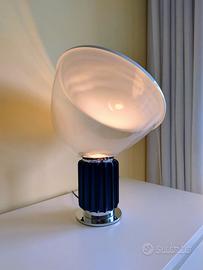 Vendo lampada di design ispirata all'iconica lampada Taccia, progettata dai fratelli Achille e Pier Giacomo Castiglioni nel 1958 per l'azienda italiana leader nel settore dell'illuminazione di design Flos. La lampada è interamente costituita da alluminio, grigio lucente per la base e nero spazzolato per il rivestimento che in origine fungeva da dissipatore del calore. Sopra alla base vi è appoggiata una campana in vetro orientabile a piacimento, sormontata da un riflettore anch'esso in alluminio (verniciato bianco). Questa lampada è stata infatti progettata per nascondere la fonte luminosa all'interno della base e far riflettere la sua luce sugli ambienti circostanti, così da produrre una sofisticata e allo stesso tempo riposante luce per gli occhi. Quella in vendita è la versione "Small", perfetta come lampada da appoggio/tavolo con le sue dimensioni di 48,5 cm di altezza, 14,2 cm di diametro della base e 37,3 cm di diametro della campana, per un peso totale di circa 3 kg. Come sorgente luminosa presenta una classica lampadina (meglio se di piccole dimensioni) con attacco E27 e potenza massima di 40W, così da poter esser cambiata in base alle proprie esigenze. Infine presenta un cavo di corrente nero lungo 1,5 metri, con classico interruttore nel mezzo. Personalmente ho comprato la lampada circa 3 mesi fa come regalo di Natale, l'ho usata pochissimo e tenuta con gran cura. La lampada sarà spedita, divisa nelle sue parti, accuratamente protetta nella confezione originaria (vedere ultima foto), con l'aggiunta di una particolare lampadina di piccole dimensioni con attacco E27 da 806 lumen a luce calda 2700K della Philips. N.B. Le varie parti della lampada (base, campana e riflettore) proprio per come è stata progettata la lampada sono semplicemente appoggiate le une sulle altre, quindi si raccomandata di prestare particolare attenzione al luogo di posizionamento della lampada.