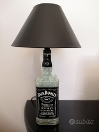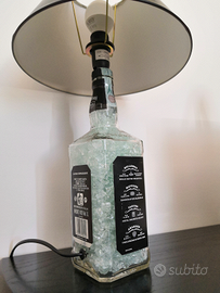 Lampada con bottiglia Whiskey Jack Daniel's da 1 litro. Bottiglia riempita con vetro temprato sminuzzato. Filo con interruttore. Disponibilità anche di altri modelli.