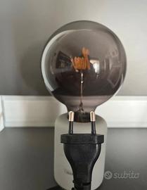 La base è in cemento opaco, solida e stabile, mentre la lampadina ha un vetro fumé elegante e filamento LED a forma di scritta.