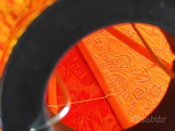 Ribassato, prezzo fermo. Lanterna vietnamita color arancione con decori in arancione piu' chiaro, struttura in ferro e bambu', i componenti neri sono di plastica. Oggetto nuovo, mai usato. misure: lunghezza 30 cm, diametro max 22 cm. Diametro foro per inserire la lampadina 5 cm. Disponibile anche nei colori viola e verde acido che vedete nell'ultima foto.