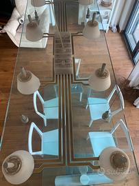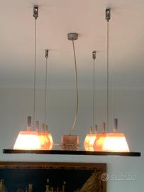 Lampada a sospensione a luce diretta. Corpolampada formato da una lastra rettangolare in vetro temperato trasparente con 8 diffusori in vetro pressato e verniciato.