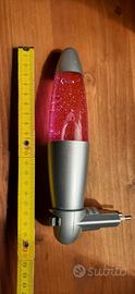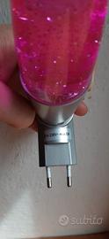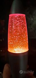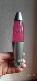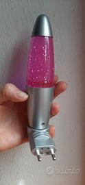 Lampada lava con liquido rosa brillante e glitter argento che si collega direttamente ad 1 presa,si accende e si spegne tramite tasto on/off, può essere utilizzata come decorazione o luce notturna .