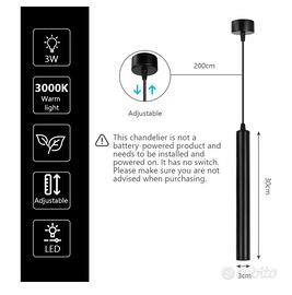 LED Lungo Lampada A Sospensione, 2 Pezzi Lampada a Sospensione Comodino Camera da Letto, Lampada a Sospensione 30cm a cilindro Nero Per Soggiorno Sala Da Pranzo Kitchen(Bianco Caldo). Design cilindrico unico - Lampadario moderno a LED, forma cilindrica nera, corpo lampada in alluminio, linee moderne e raffinate, che donano eleganza all'ambiente, l'emissione di luce verso il basso fornisce una piacevole luce calda, aggiungendo più elementi di moda alla tua casa. Luce per la protezione degli occhi a spettro completo Ra ≥ 98 - Adottando una sorgente luminosa americana Pu Rui ad alta resa cromatica, può fornire un'illuminazione vivida e naturale, ripristinare altamente il colore reale degli oggetti, può riprodurre la luce solare all'interno, fornire una fonte di luce sana, ripristinare altamente il colore reale degli oggetti, alleviare l'affaticamento visivo degli occhi umani e ridurre il disagio oculare. Dimensioni - 30*300 mm. Corda sospesa: 200 cm. Potenza: 3 W (bianco caldo 3000 K). Nuova sorgente luminosa a LED, protezione per gli occhi, alta luminosità. Semplice ed elegante. Non importa dove installi la lampada, puoi goderti l'ambiente rilassato ed elegante che crea. Installazione flessibile - l'installazione della lampada è semplice e veloce. Due metodi di installazione, installazione diretta a soffitto e installazione con binari di scorrimento, anche la pulizia della lampada è semplice grazie alla sua forma semplice. È sufficiente una semplice pulizia con un panno per rimuovere la polvere dalla lampada. Applicabile a una varietà di scene - molto adatto a ristoranti, cucine, bar, ristoranti, chiese, camere da letto, soggiorni, corridoi, foyer, riunioni, uffici e altri luoghi, indipendentemente da dove è installata la lampada, puoi goderti l'atmosfera rilassata e atmosfera elegante che crea.