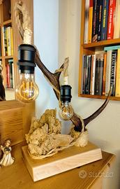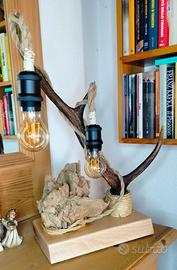 Lampada fatta a mano, realizzata con corno di cervo, legno e pietra "rosa del deserto". Misure circa 25x40x50cm Pezzo unico.