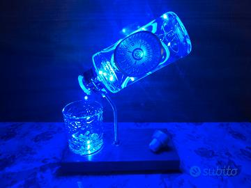 Lampada decorativa con una bottiglia in vetro e luci LED. - Base in legno. - Dettagli in metallo. - Illuminazione blu.