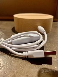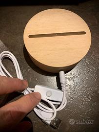 La base è in legno con luce bianca fredda, ed è incluso un cavo USB per l'alimentazione; in questo modo potrai collegare la lampada a qualsiasi dispositivo con USB o a qualsiasi spina della tua casa, usando un adattatore USB oppure 3 batterie AAA (non incluse)