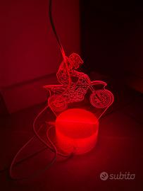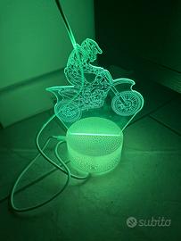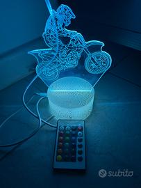 Lampada led da tavolo notturna con illusione ottica 3D. La figura del motociclista è incisa al laser su una lastra di acrilico o plexiglass che, una volta illuminata dalla base, crea l'illusione di un'immagine tridimensionale. 7 cambi di colore, telecomando incluso. Vendo per inutilizzo. Ritiro a mano a Milano o possibilità di spedizione.