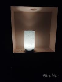 Lampada led moderna cilindrica, paralume in tessuto grigio chiaro.