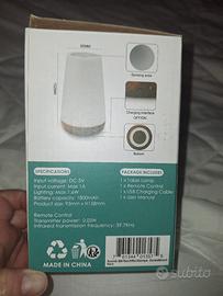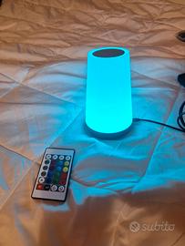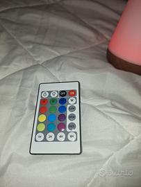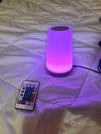 Lampada da tavolo a led di vari colori, trasportabile ovunque, ricaricabile con usb in dotazione. Utile anche nella camera dei bambini con luminosità regolabile anche da telecomando. Cambio colore con touch nella parte superiore o dal telecomando. Praticamente nuova. In plastica con base simil legno.