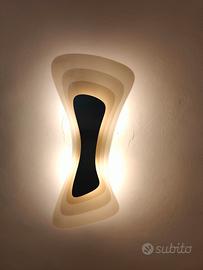 lampada da parete/soffitto con montatura in acciaio satinato, diffusore in lastra di vetro decorato. La particolarità è il colore del diffusore: quando è spento è bianco lucido, quando è acceso nuance sabbia