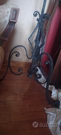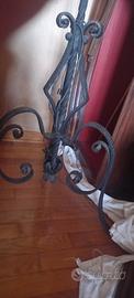 Splendida lampada liberty il ferro battuto finalmente lavorato con treppiede e paralume in tessuto color giallo, chiaro.