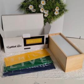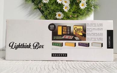 Lampada da tavolo Seletti Lighthink Box con tre frontali intercambiabili: SMILE, LIVE, PARADISE più uno BIANCO personalizzabile.