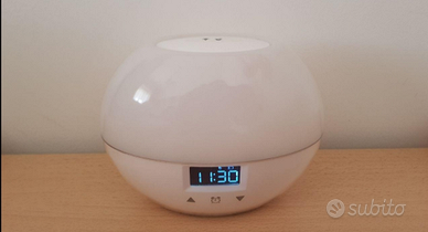 Vendo Lampada/sveglia in foto. Ha la funzione unzione alba e tramonto (la luce si accende/spegne gradualmente a partire dall'orario impostato). Vari suoni sveglia disponibili e vari colori di luce. Con batteria interna, ricaricabile (ma funziona anche se sempre collegata alla corrente). Nuova e in scatolo originale, regalo doppio.