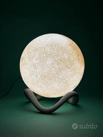 Lampada a forma di Luna, realizzata con stampa 3D ad altissima definizione, che riproduce fedelmente crateri e dettagli della superficie lunare, con piedistallo moderno effetto pietra.