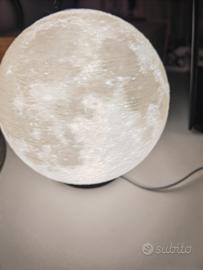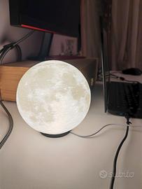 stampa 3D di lampada a forma di luna bianca con luce led interna ed interruttore. non comprende il caricatore. la lampada è fluorescente quindi dopo averla spenta risplende al buio.
