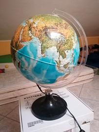 Mappamondo luminoso da tavolo. Cartografia classica con doppio effetto: aluce spenta la geografia rappresentata è di tipo fisico quando la luceviene accesa emergono informazioni di tipo politico.